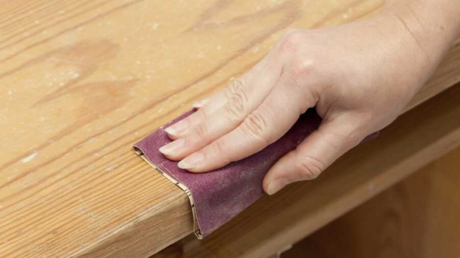 Чтобы краска не отваливалась после нанесения, с ламинированной поверхности необходимо снять верхний слой. Для этого подойдет наждачная бумага. Сначала стоит пройтись наждачкой с более крупным зерном, чтобы снять ламинирующий слой, а затем обработать мебель наждачкой с мелким зерном. Такая обработка создаст шероховатую поверхность, на которую лучше ляжет краска.