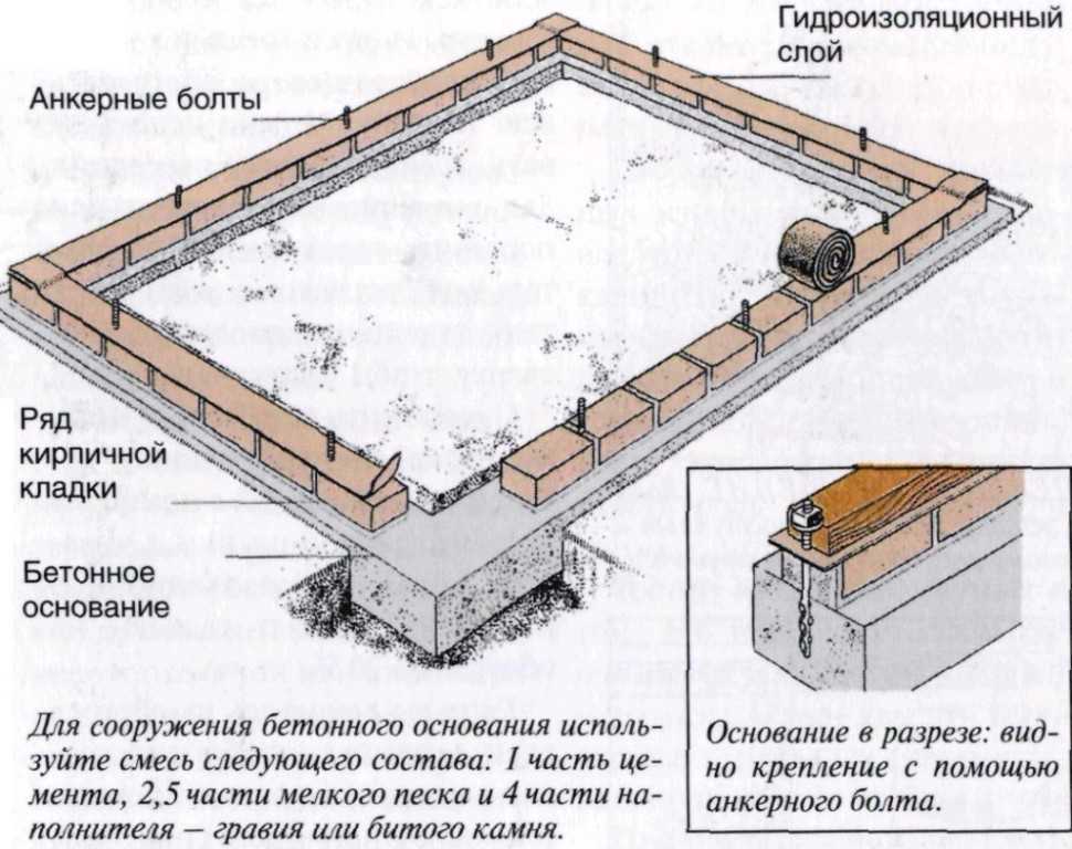 Устройство фундамента и нижней обвязки: 1 – ленточный фундамент; 2 – цоколь; 3 – рубероид; 4 – нижняя обвязка; 5 – подлаговые столбики; 6 – лаги; 7 – продольные элементы первого венца; 8 – поперечные элементы первого венца; 9 – стойки дверных коробок; 10 – анкер; 11 – песчаная подушка; 12 – доски опалубки; 13 – накладка; 14 – опорный кол; 15 – распорка; 16 – подкос; 17 – притвор; 18 – нагель; 19 – паз для крепления перегородки; 20 – сквозной паз.