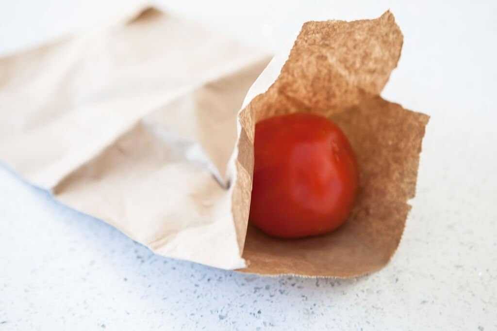 К дозревающим томатам можно подкладывать несколько спелых плодов или несколько спелых фруктов, например банан, яблоко. Так повышается концентрация этилена, от которого появляются покраснения на помидорах и плод быстрее созревает.