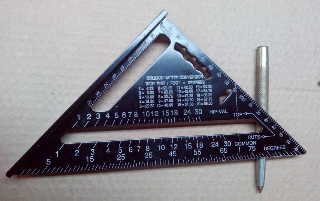 Так чем же хорош оригинальный угольник Свенсона (swanson speed square) и что он собой представляет. В классическом исполнении данный угольник сочетает в себе также транспортир для того чтобы наиболее точно производить разметку деталей во время производства стропильной системы каркасного дома, системы лестниц и лестничных маршей.