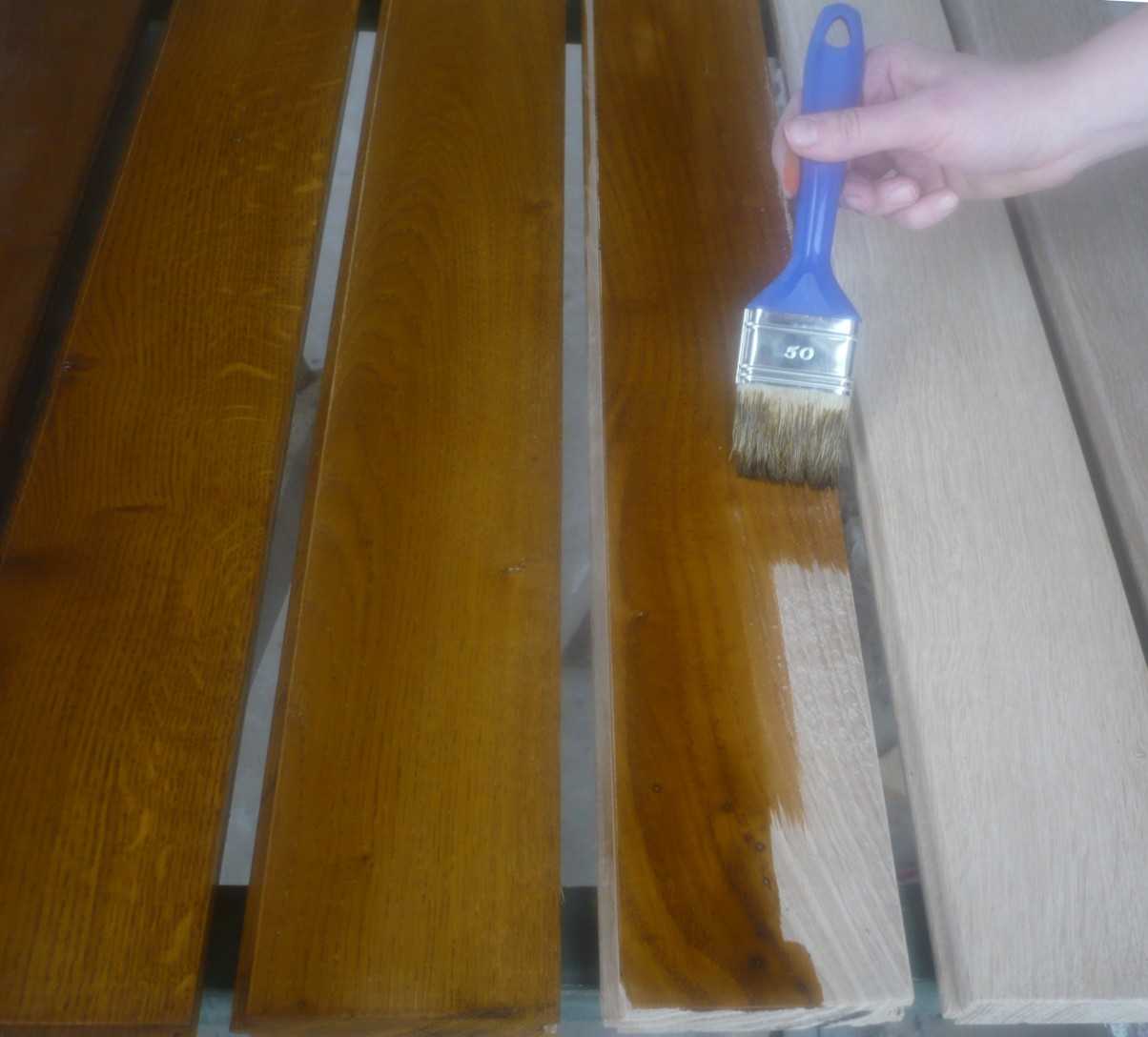Чтобы выбрать наиболее оптимальный вариант часто делают несколько пробных выкрасов. Для этого несколько дощечек покрывают разными морилками. После чего делают выбор.