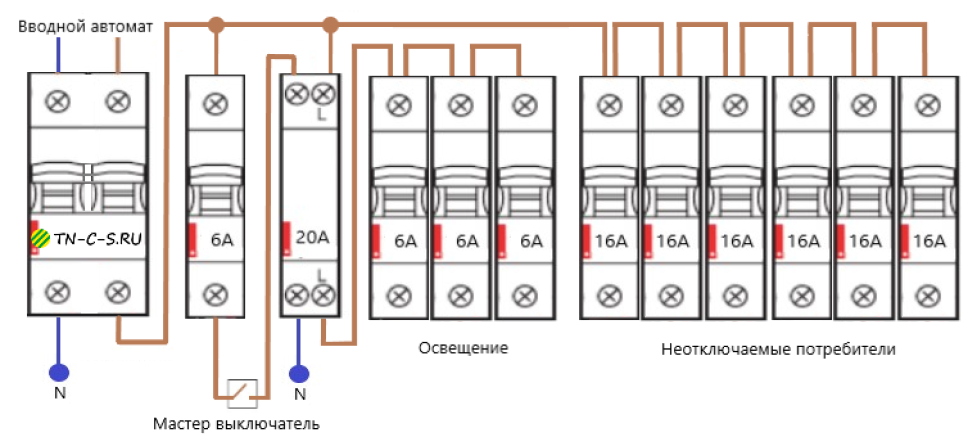Иногда с помощью мастер выключателя обесточивают всю квартиру. Конечно, кроме важных потребителей – холодильника, стир.машины, системы защиты от протечек. К этому списку можно добавить всю слаботочку и бытовую технику, у которых при отключении электричества могут “сбиться” настройки. Насколько такая схема удобна в применении сказать трудно. Если есть опыт использования мастер-выключателя – буду благодарен за комментарии.