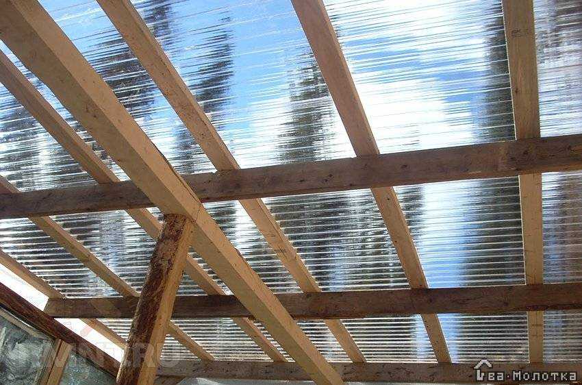 Укладка волнового прозрачного шифера осуществляется на деревянный каркас. Обрешётка собирается из бруса размером сечения 50х50 мм. Допускается замена на металлический профиль, предварительно окрашенный в белый цвет. Это способствует снижению деформации из-за нагревания солнечными лучами.