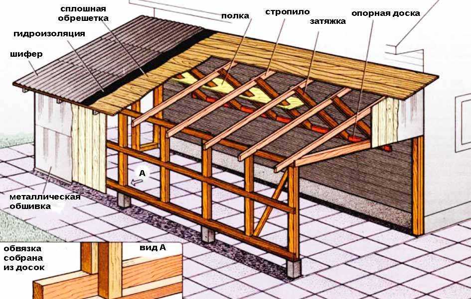 В случае примыкания гаража к дому один конец стропил фиксируется на стене здания, для чего на ней можно собрать поддерживающий каркас