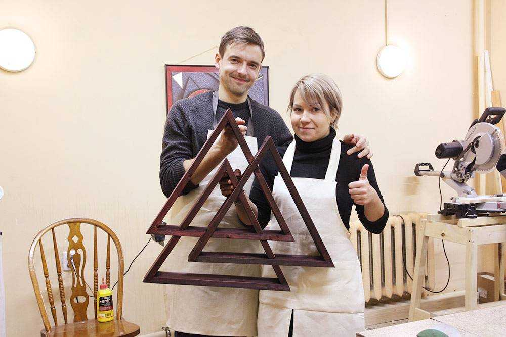Уроки проходили по выходным. Мы с Владимиром находили популярные изделия из дерева на Пинтересте и пытались воспроизвести их на занятиях. Для первого урока выбрали полку из трех пересекающихся треугольников. Чтобы мастер-класс не был слишком долгим, заготовки делали заранее: распиливали доски на нужную длину и толщину, чтобы ученикам оставался минимум столярной работы. На занятиях они шлифовали, сверлили отверстия для крепежа, соединяли, в некоторых случаях покрывали изделия морилкой и лаком. Но даже так урок длился 4,5 часа.
