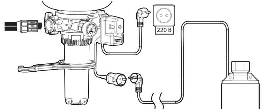 - После установки насоса в источник и проверки качества соединения системы «КРАБ» с насосом и с водопроводной сетью, подключите «КРАБ» к источнику электропитания с напряжением 220 В.