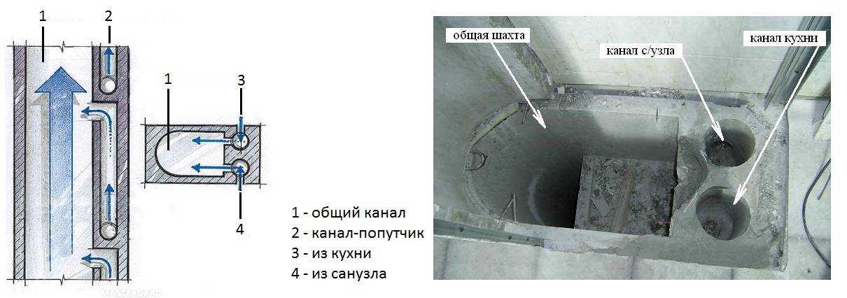 Вентканалы разных помещений с естественной вытяжкой загрязненного воздуха рекомендуется предусматривать раздельными, исключая одноуровневые сборки. Если такая возможность в многоквартирном здании отсутствует, необходимо предусмотреть подведение отдельных труб в одну вертикальную шахту.