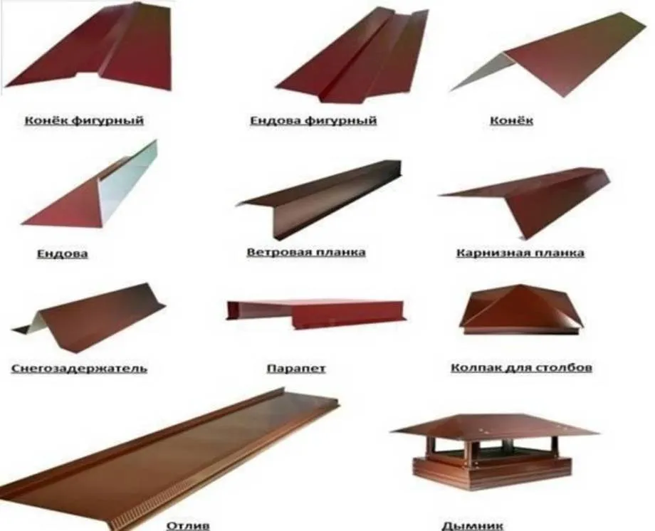 Металлочерепицу сейчас фактически никто не стелет без дополнительных профилей, что производители предлагают для комплектации коллекций. Это конек, карниз, планки на фронтон или нижняя, верхняя ендова, снегозадержатели. Количество этих элементов также можно рассчитать с помощью калькулятора для металлочерепицы на крышу. Если самостоятельно определять расход, то планки, как правило, поступают в продажу длиной до 2 метров и здесь нахлесты соблюдаются всего на 100 мм. То есть, например, торцевых профилей понадобится (18*2)/1,9=18,9 или 19 штук на каждую сторону.