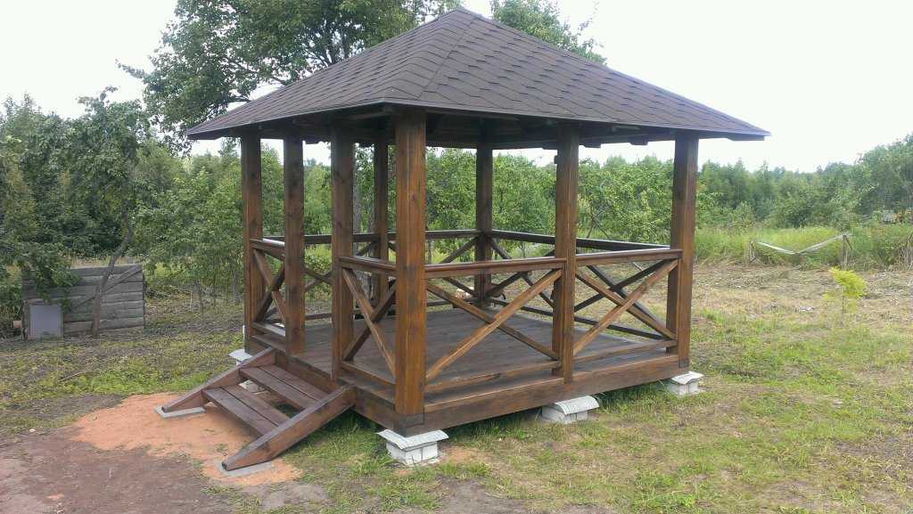Для создания данного варианта можно следовать стандартным указаниям, лишь беря во внимание размеры беседки и форму. Прежде всего создается фундамент, желательно столбчатого тип