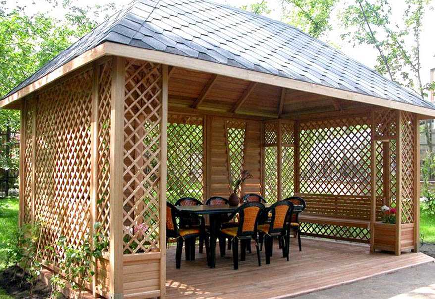 Чаще всего пространство между угловыми опорными столбами зашивают наглухо доской. Но делают это на одну треть высоты стен. Чтобы не задувало ветром снизу сидящих за столом. Остальную часть стен оставляют открытой. Это классический вариант деревянной беседки. Но не редко пространство между опорными столбами закрывают простой обрешеткой из деревянных реек. Величина ячеек подбирается по вкусу.