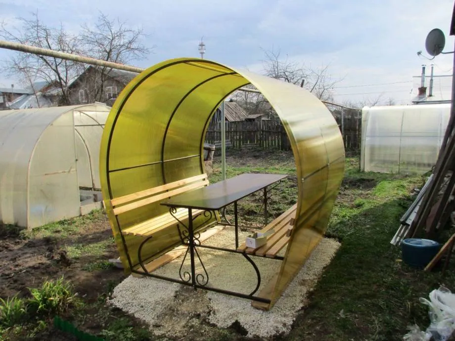Металлическая беседка более прочная и надежная, но она потребует больше сил. Чаше всего ставят металлическую основу, которую накрывают поликарбонатом.
