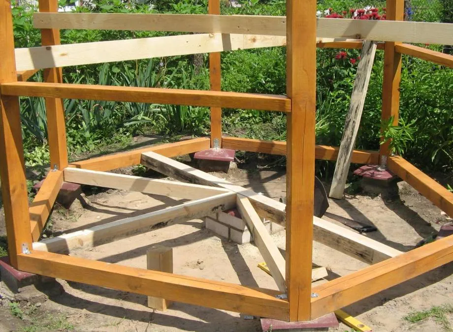 - Прежде всего для такого строения требуется установка четырех деревянных брусков по углам беседки с пропилами для монтажных креплений связки по диагонали.