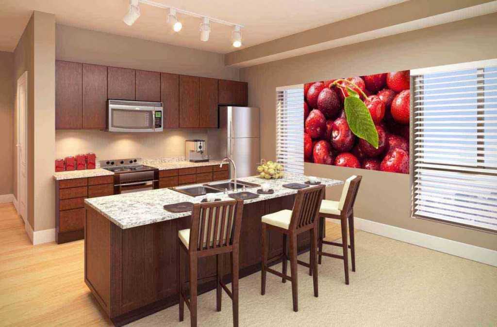В кухне можно использовать изображения разных продуктов (выпечка, ягоды, пирожные, чашка кофе). А также можно выбрать пейзажи и абстракцию.