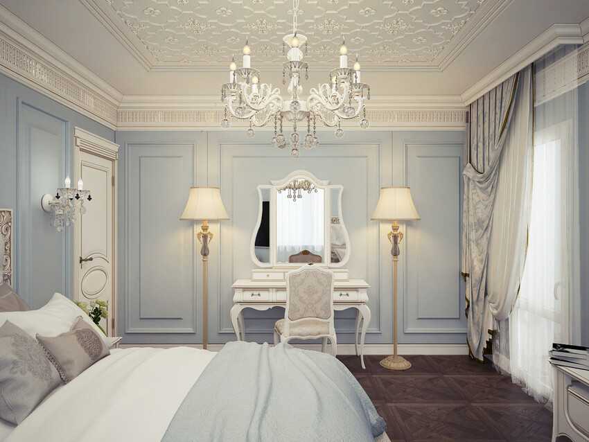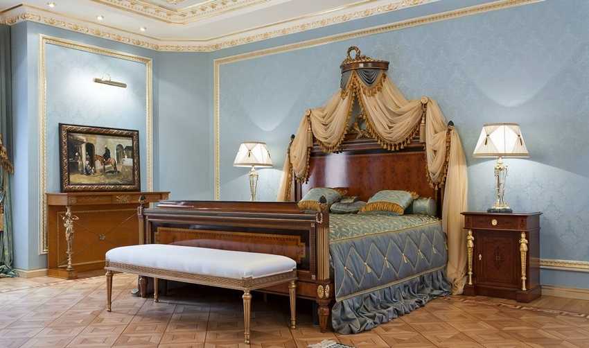 Независимо от того, в каком стиле оформлена голубая спальня, к выбору мебели нужно подойти с особым вниманием. Лучше всего установить кровать, тумбы, комод, столики и кресла из дерева