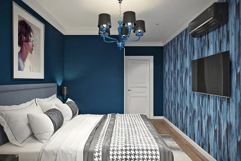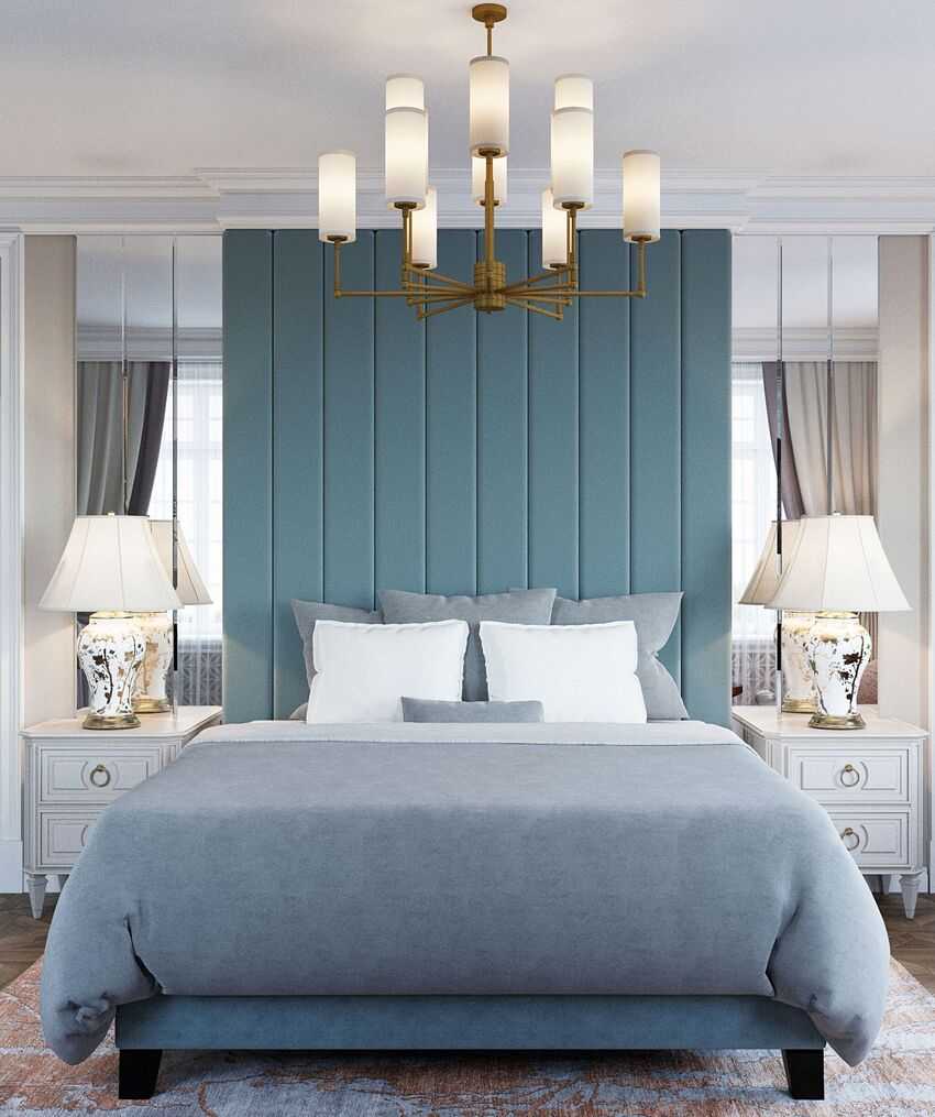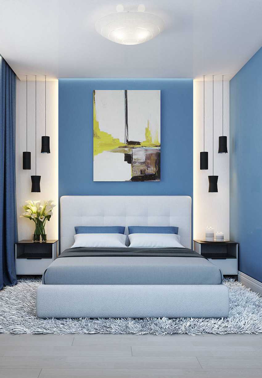Яркие голубые акценты допустимы только в прикроватной зоне или в виде небольших вставок по периметру комнаты, поскольку изобилие броских цветов может отвлекать от отдыха и сна.