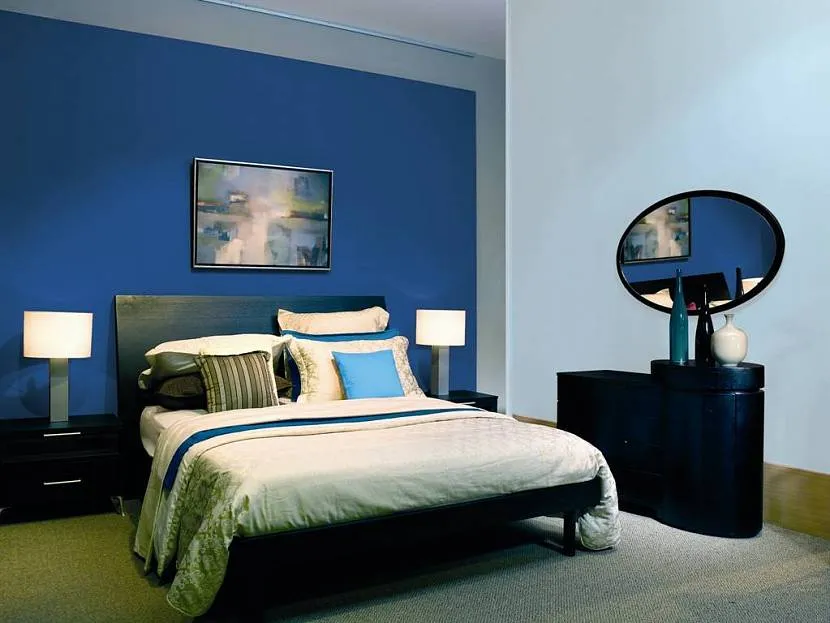 Классическим является сочетанием в интерьере синего цвета с белым. Всматриваясь в такой тандем, сразу видишь бескрайнее небо с плывущими воздушными облаками. Такое сочетание дополнится белой мебелью, что сделает дизайн помещения полным и завершенным. Необычно и загадочно выглядит помещение, где используются черно-синие обои, которыми отделана акцентная стена. Чтобы комната не казалась мрачной, в нее следует добавить светлые детали. Потрясающий эффект дает отделка помещения методом градиента, где комбинируются тона от ярко-синего до голубого.