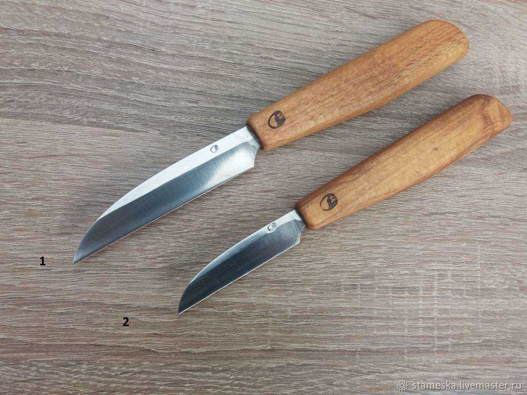 Нож татьянка отличается длинной ручкой. Скошенное лезвие при работе находится в 2-х сантиметрах от руки мастера, что позволяет создавать мелкие элементы. Богородские ножи выпускаются в нескольких моделях, ими можно выполнять черновую и тонкую резьбу. У этого инструмента ручка имеет полукруглый контур, лезвия имеют частичную заточку, аналогично перочинному ножику. Косяк по строению идентичен сапожному профессиональному инструменту. Его лезвие скошено под углом 45°, заточка односторонняя.