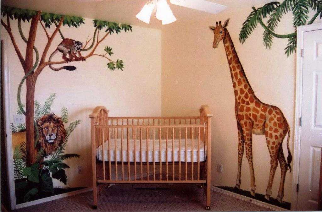 - Также стены можно украсить росписью в виде силуэтов животных и тропических растений.