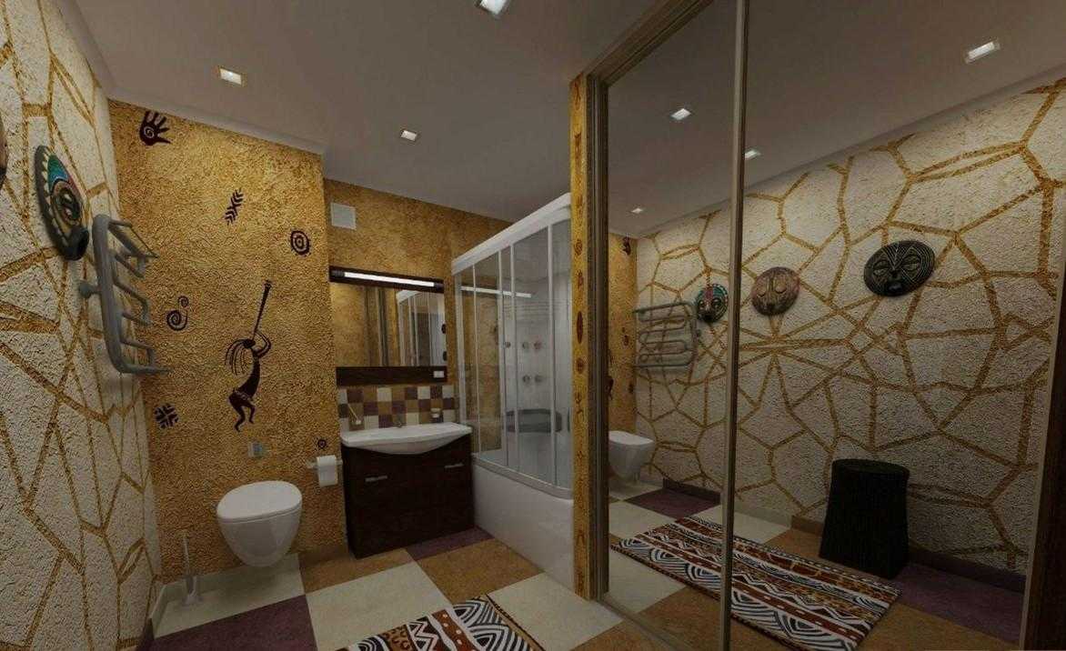 Ванная в африканском стиле будет представлять собой довольно пустое, не заполненное деталями помещение. Цвет стен для комнаты выбирается кремовый, кофейный, белый или может быть тёмно-коричневым.