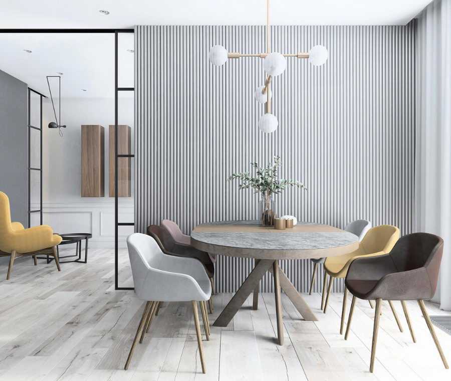 Стиль позволяет комбинировать разные цвета и материалы. В дизайне одной комнаты будут гармонично смотреться пастельные обои, например с геометрическими узорами одного цвета, но разной насыщенности. Мебель имеет простые формы, а декоративные предметы подчеркнут стилистику комнаты.