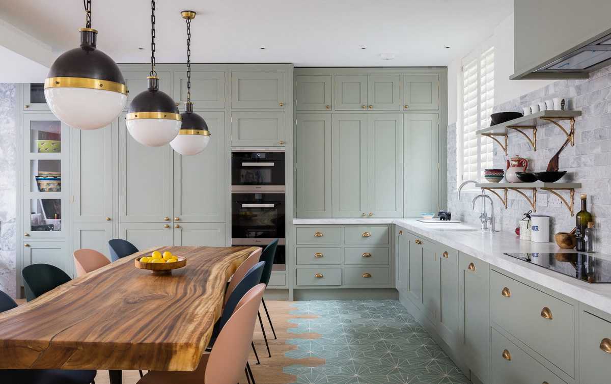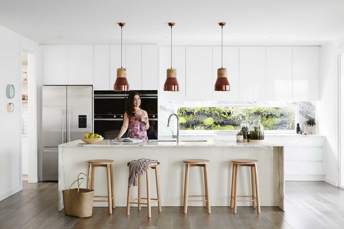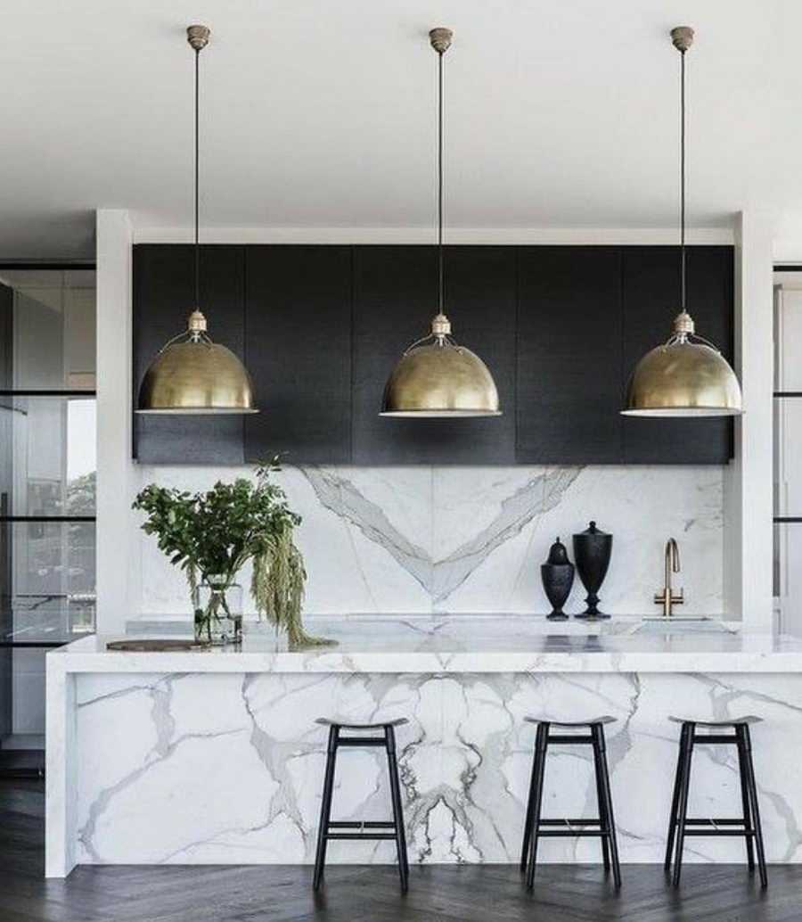 В длинных кухнях идею основного освещения можно поддержать рядом свисающих плафонов. Впрочем, в очень больших помещениях 4-5 расположенных в ряд светильника над обеденным столом помогут выделить столовую зону, даже если она находится не по центру.