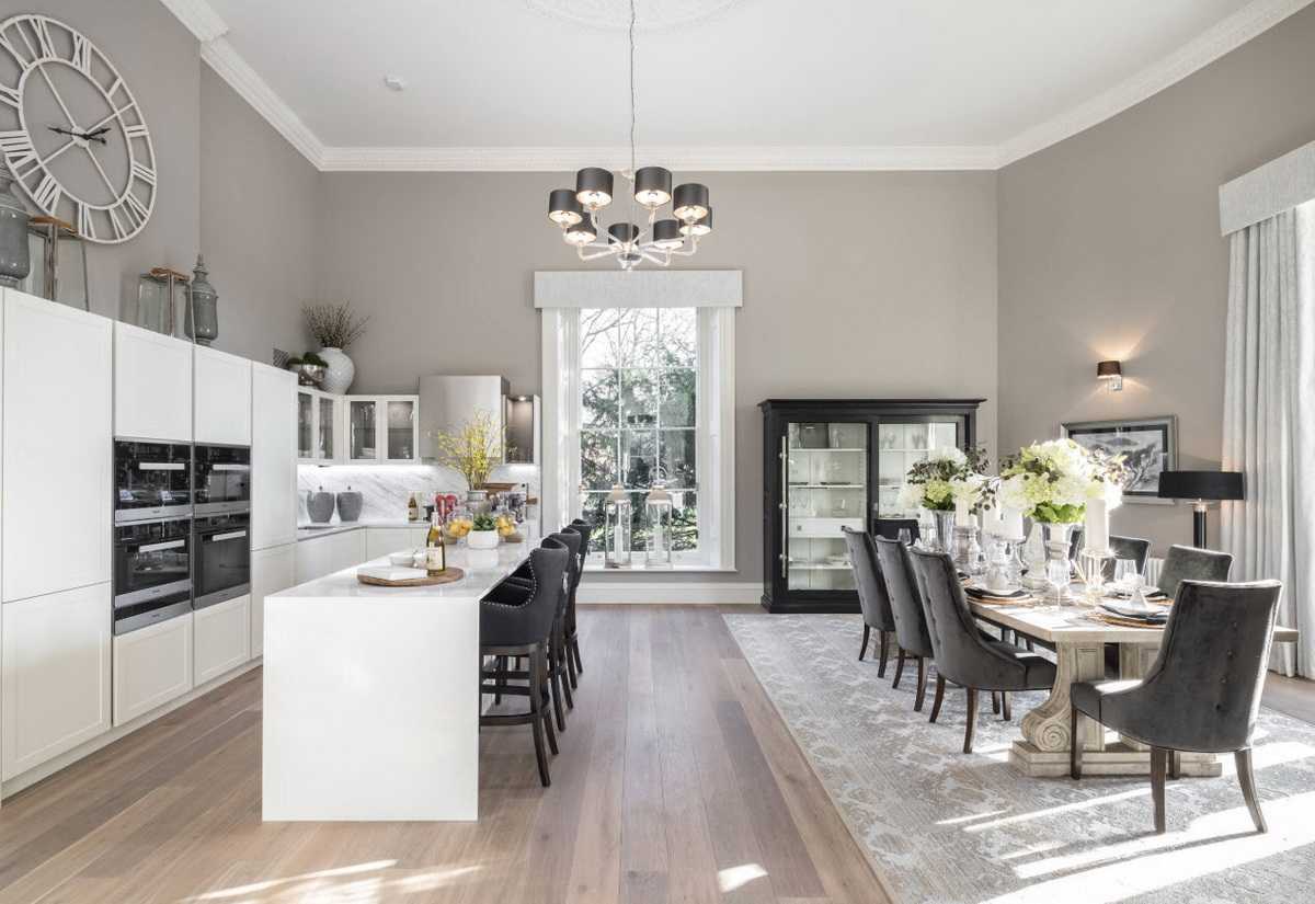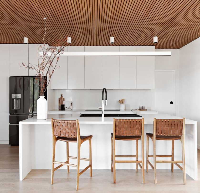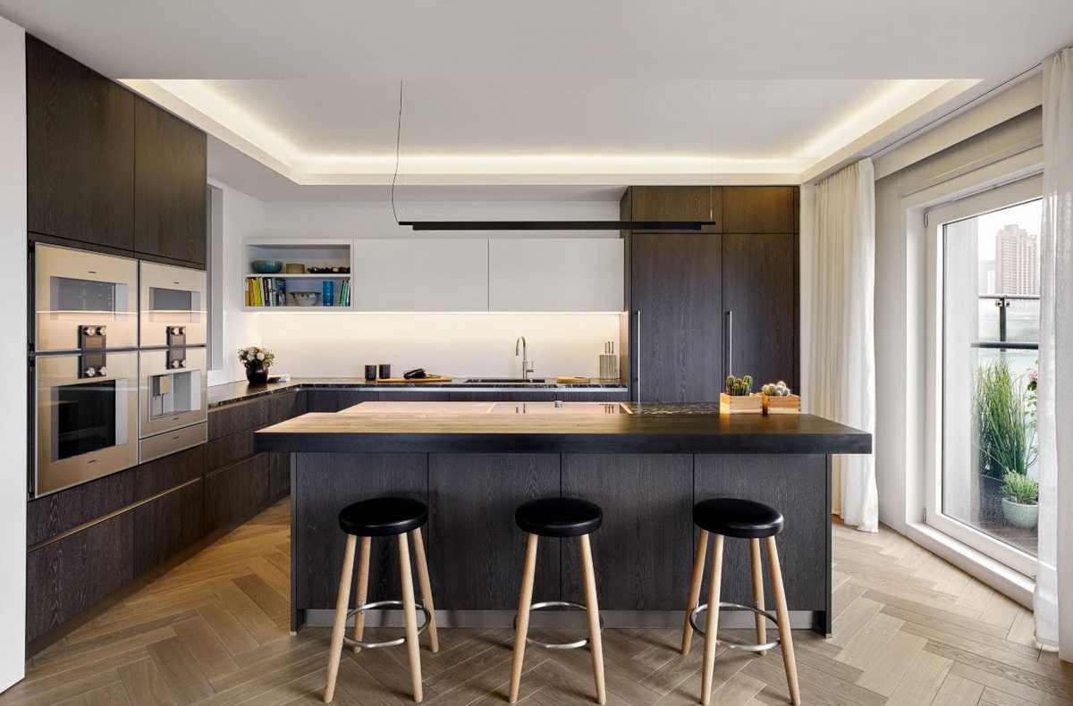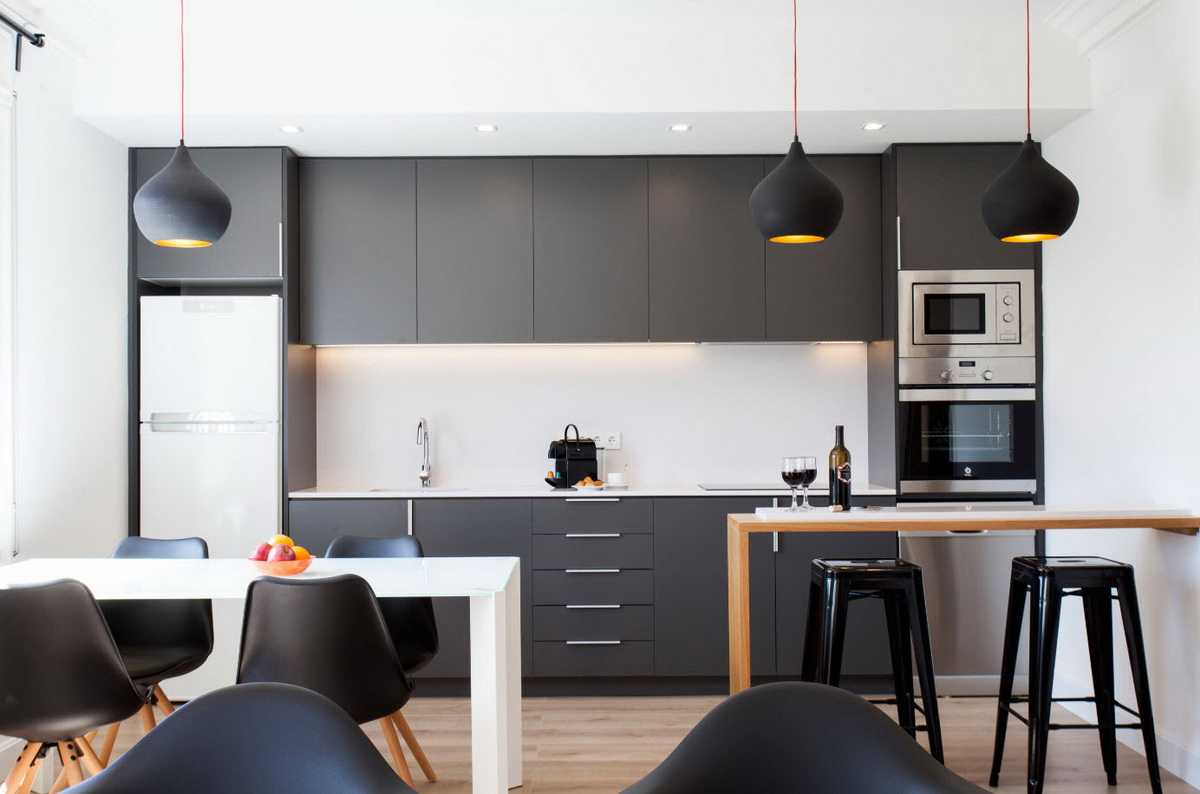 В длинных кухнях идею основного освещения можно поддержать рядом свисающих плафонов. Впрочем, в очень больших помещениях 4-5 расположенных в ряд светильника над обеденным столом помогут выделить столовую зону, даже если она находится не по центру.