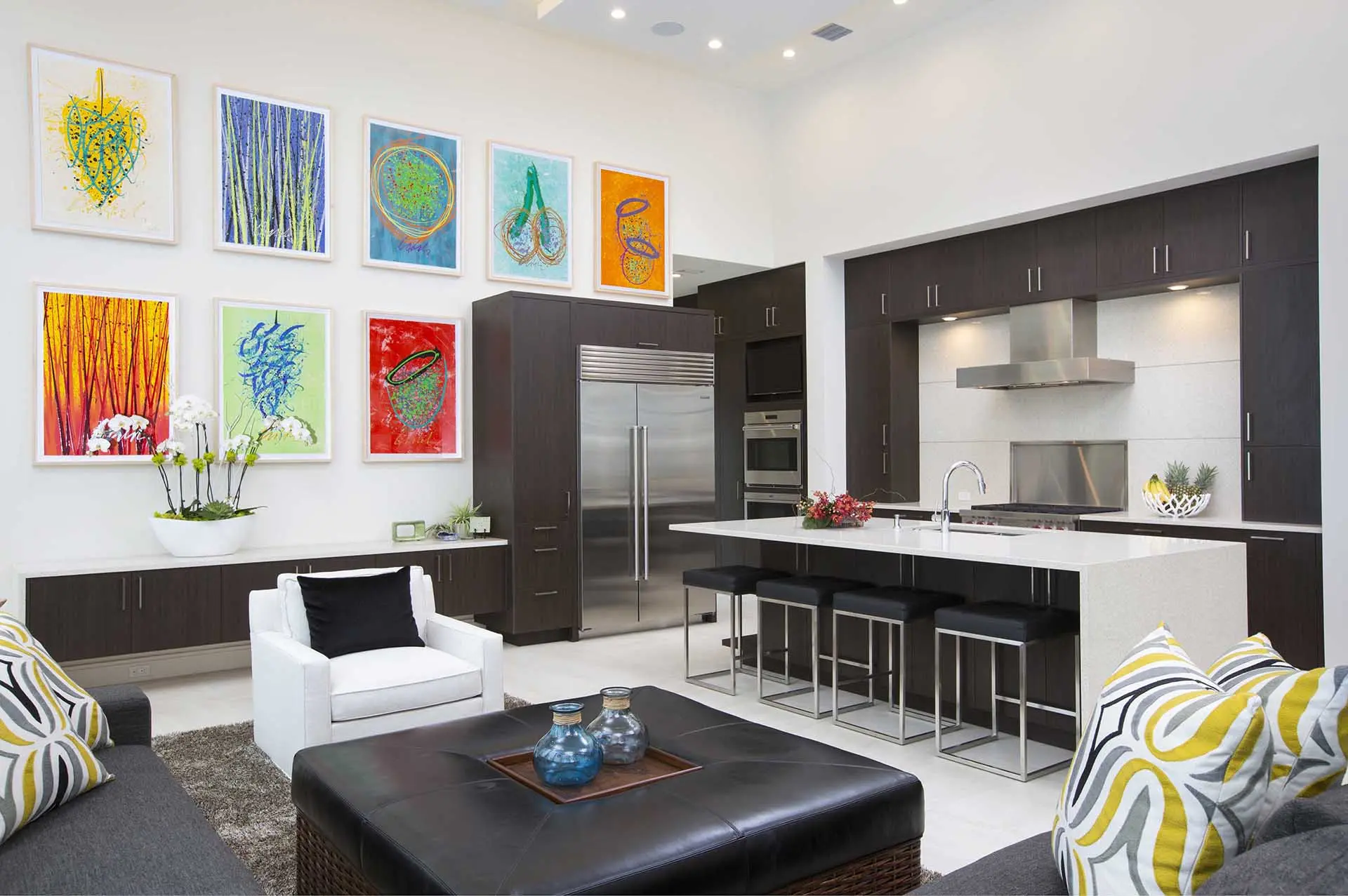 - Рамки для картин и фотографий. Купите в любом магазине для дома белые рамки для фотографий и покрасьте их в яркий цвет, который будет хорошо сочетаться с гарнитуром. Если основной цвет кухни белый или бежевый, для дополняющих деталей выберите любой понравившийся яркий цвет. Белый и бежевый отлично сочетаются со всей палитрой.
