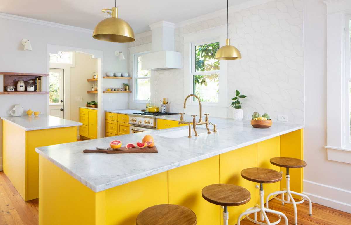 благодаря сочетанию белого и желтого интерьер кухни станет светлым и уютным