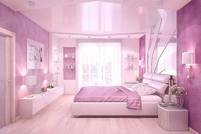 В зависимости от этой характеристики, владелец спальни определяет тип узора, его цвет и фактуру. Для потолков высотой менее 2,5 м выбирают полотна светлых тонов, на которых нет крупных узоров и грубой текстуры.
