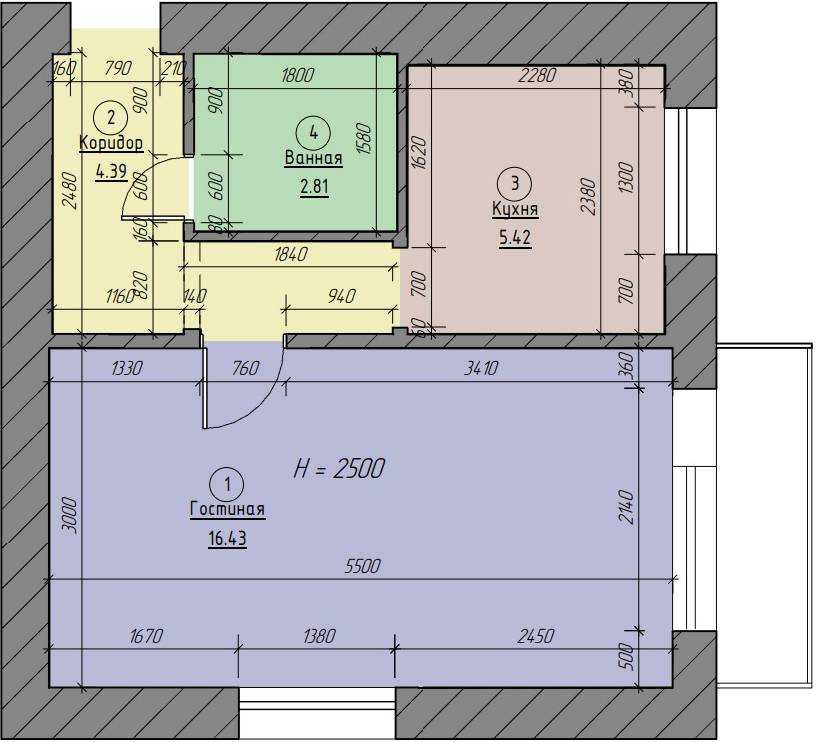 Обмерный план квартиры. Я восстановила исходную планировку. Раньше на месте фиолетового прямоугольника были две маленькие комнаты