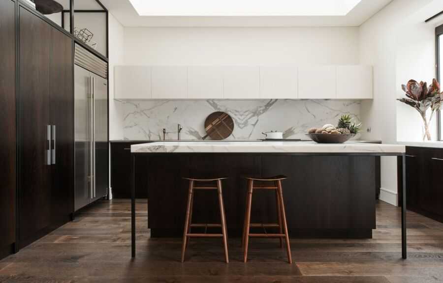 В данном случае чаще всего темно-коричневую кухню разбавляют пепельными тонами и металликом, что придает пространству строгости и в то же время роскоши. Также используются теплые бежевые оттенки в сочетании с серым.