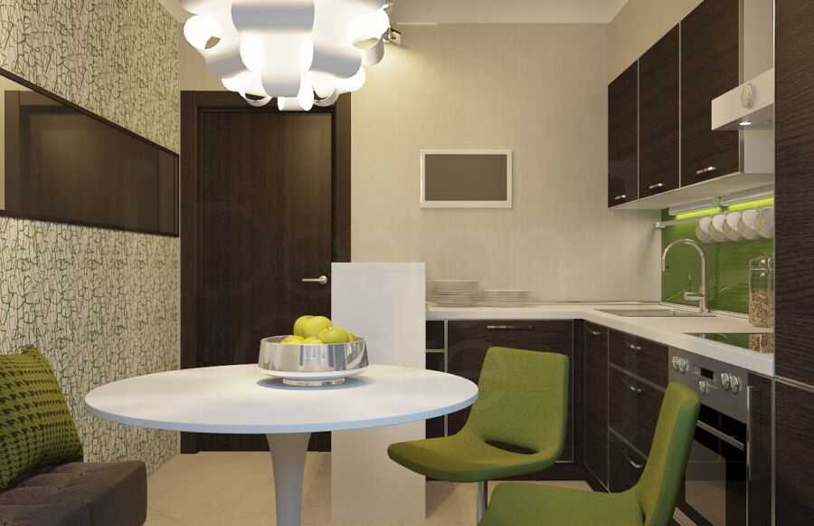 Коричневый цвет в сочетании с зелеными оттенками редко встречается на кухонных интерьерах, но тоже имеет право на жизнь. Ярко-салатовый оттенок фасада можно уравновесить фартуком светло-коричневого цвета с проступающей фактурой дерева. Или выбрать ненавязчивые оттенки «с зеленцой» в стиле прованс.