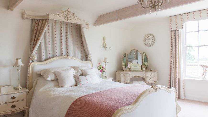 Все оттенки белого. Особая атмосфера свежести и чистоты всегда присутствует в спальне, оформленной в белых тонах с оттенком скандинавских мотивов. В этом случае для отделки стен используется фактурная штукатурка молочных оттенков или панно, покрытые тонким слоем белой краски или красящего лака, позволяющие сохранить красоту текстуры древесины. Вместе с визуально состаренными полами они создают идеальный фон для белой винтажной мебели, дополненной текстильными украшениями в светлых пастельных тонах.