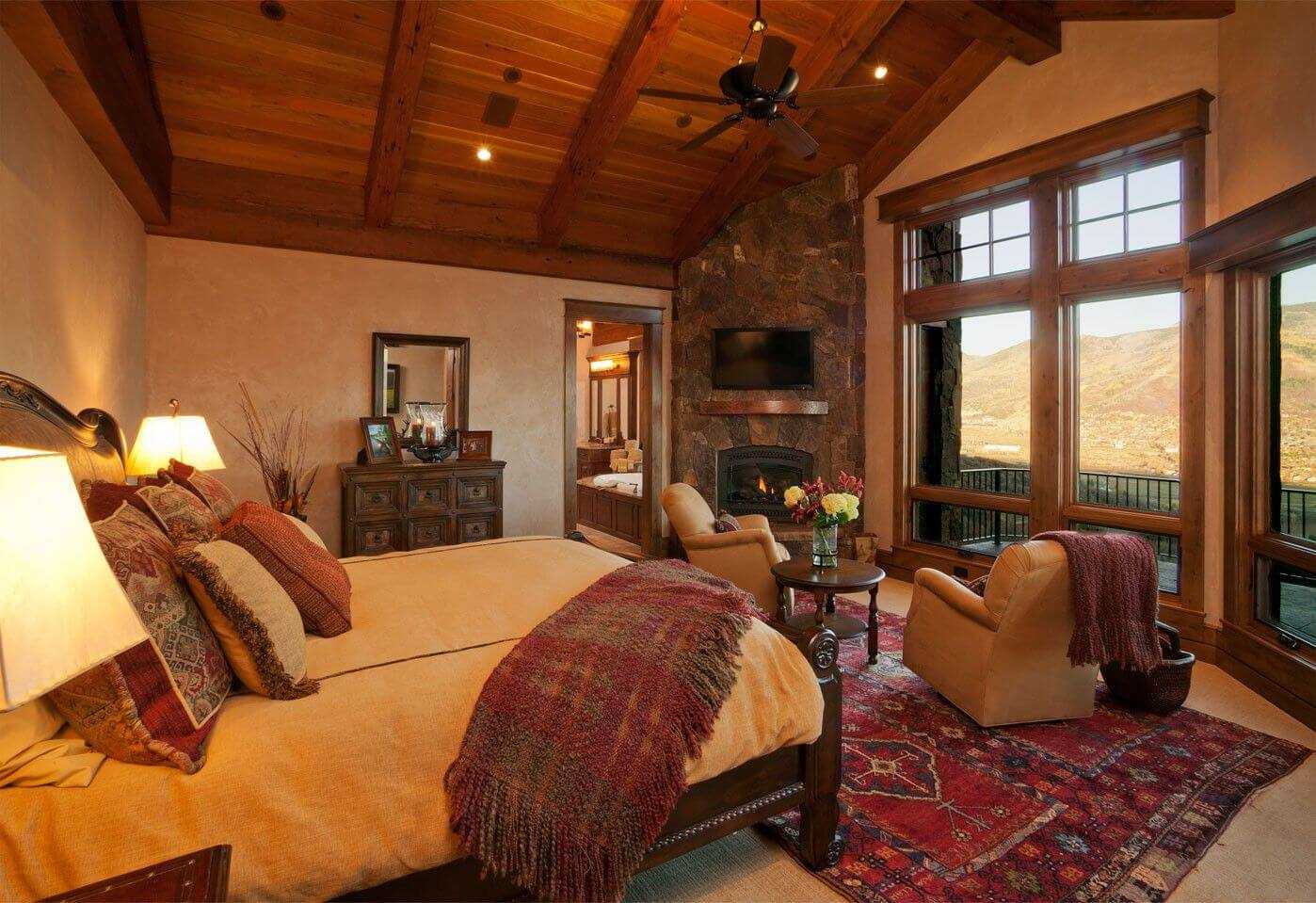 Для любителей охоты можно оформить дом в стиле шале. Здесь нужна массивная мебель и спокойные приглушенные цвета песочного и коричневого. Обязательно должен быть в спальне камин, декор в виде шкур, рогов животных ит. Такой стиль требует хороших финансовых вложений. Это хороший вариант для одноэтажного деревянного дама на три спальни.