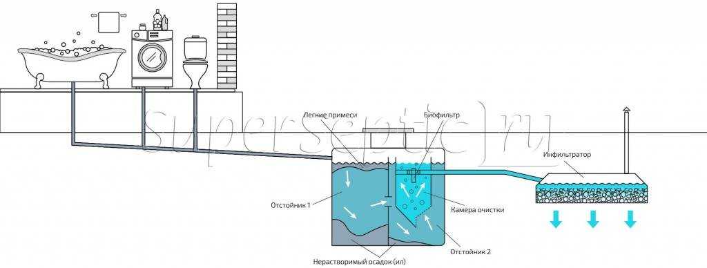 - В зависимости от модели очистной станции, очищенная вода откачивается насосом или используется принцип самотека.