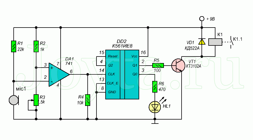 Звук от хлопка проходит через микрофон, там усиливается и трансформируется электрический импульс. Далее происходит выравнивание звука благодаря работе выпрямляющих диодов. Звук находится под контролем резистора (если уровень громкости звука ниже заданного, резистор не допустит срабатывания прибора).