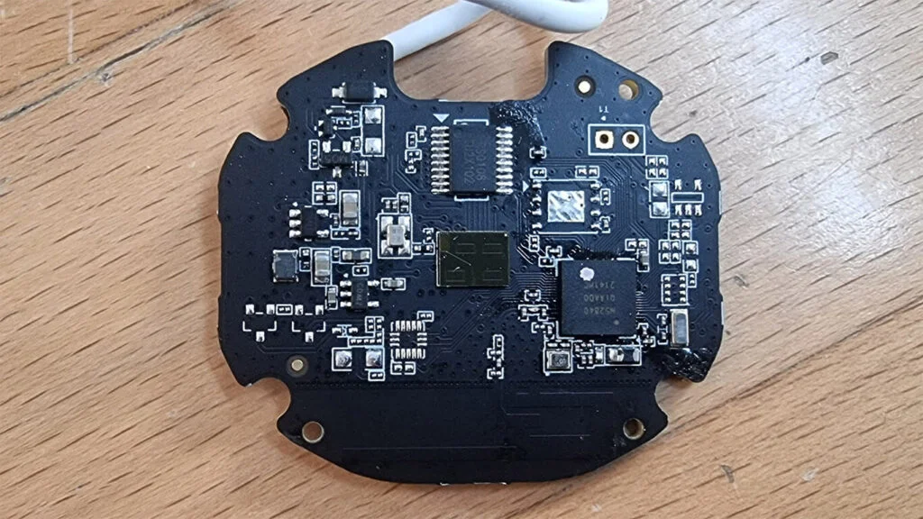 On the inside of the PCB, the ZigBee communications module, the mmWave sensor as well as some resistors and diodes are soldered. This is the complete device, which is tiny, compared to its outer shell.
