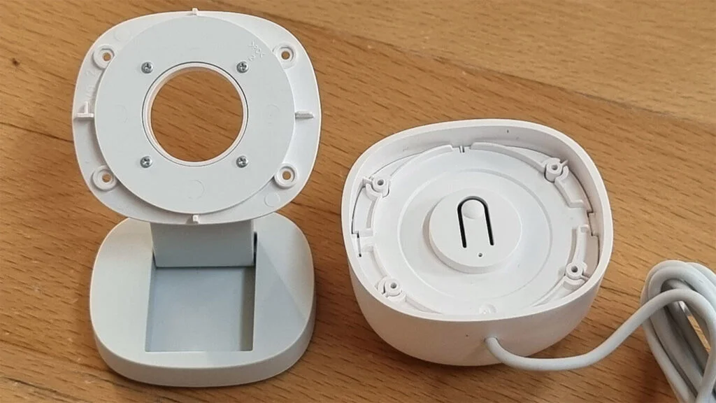 On the backside, a QR sticker is placed on the mounting swivel which takes you to the store to install their official app. We are not doing that of course, as the FP1 is going straight to Home Assistant. The back plate is a powerful magnet by itself, which can be mounted to any metal surface without any accessories.