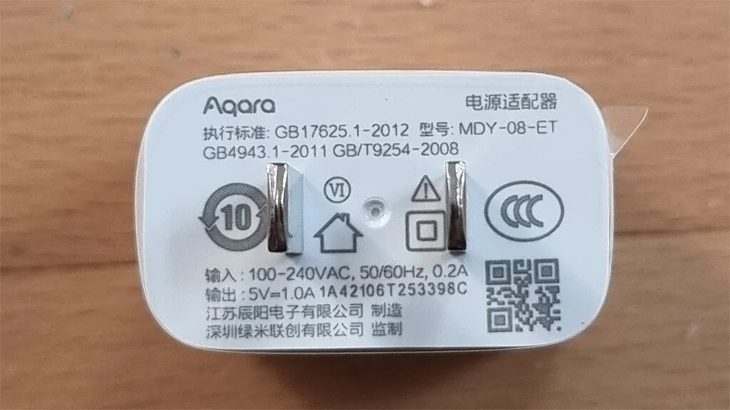 The power supply is an official Aqara adapter rated for Input = 100-240VAC, 50/60Hz and Output = 5V1.0A. The plug is the US version, but depending on the seller, an adapter converter is sent to you for EU or UK plugs.