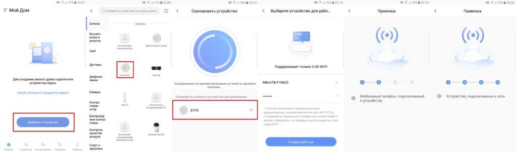 - Программное обеспечение обнаружит все доступные шлюзы и предложит их добавить. Выбираем нашу модель и вводим пароль от Wi-Fi в следующем окне. При этом смартфон должен обязательно быть подключен к Wi-Fi 2.4 ГГц. На следующем окне, когда появится надпись “Мобильный телефон, подключенный к устройству”, необходимо вручную подключить смартфон к Wi-Fi сети шлюза – “lumi-gateway-******”.