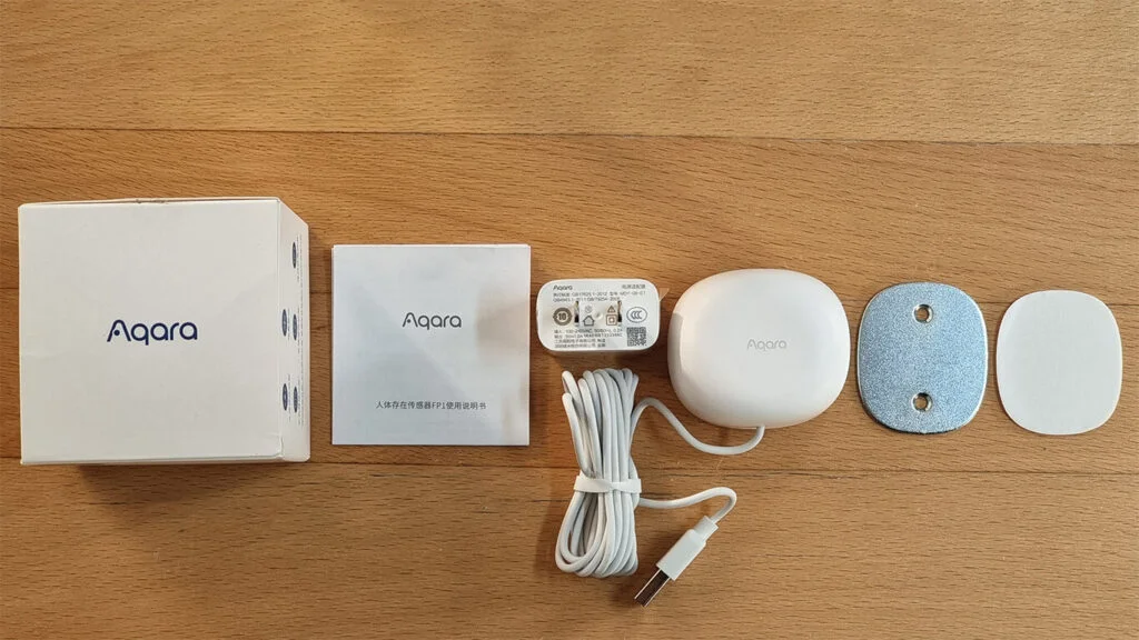 The Aqara FP1 Human Presence Sensor is currently being officially sold only in Asian markets. That means, the packaging is not adjusted for western markets, and the box and labeling are all in Chinese.The box contains the sensor, an adapter, a manual and a metal plate with a sticker for mounting the device.