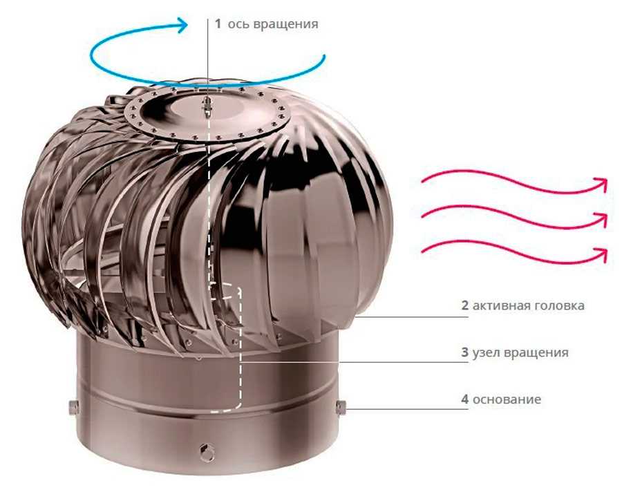 Конструкционные особенности этого устройства трудно назвать сложными. Под воздействием силы ветра колпачок начинает вращаться, создавая при этом разрежение в трубе. Корпус, или нижняя часть, крепится непосредственно к вентиляционному отверстию.