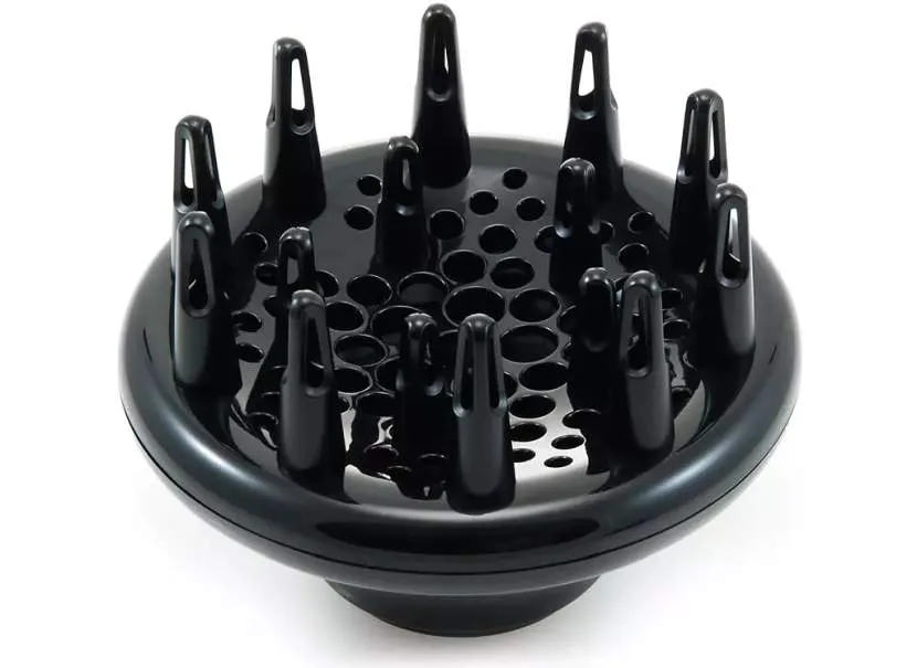 Рассмотрим, что такое диффузор в парикмахерском инструменте. Здесь это сменная насадка с крупным диаметром и узким основанием. Деталь дополнена равномерно распределенными шипами («пальцами») на перфорированном диске. Такое исполнение изначально разрабатывалось для сушки волос после химической завивки без эффекта их спутывания. Принцип срабатывания заключается в фиксации локонов и обеспечении бережного воздействия рассеянного воздушного потока.