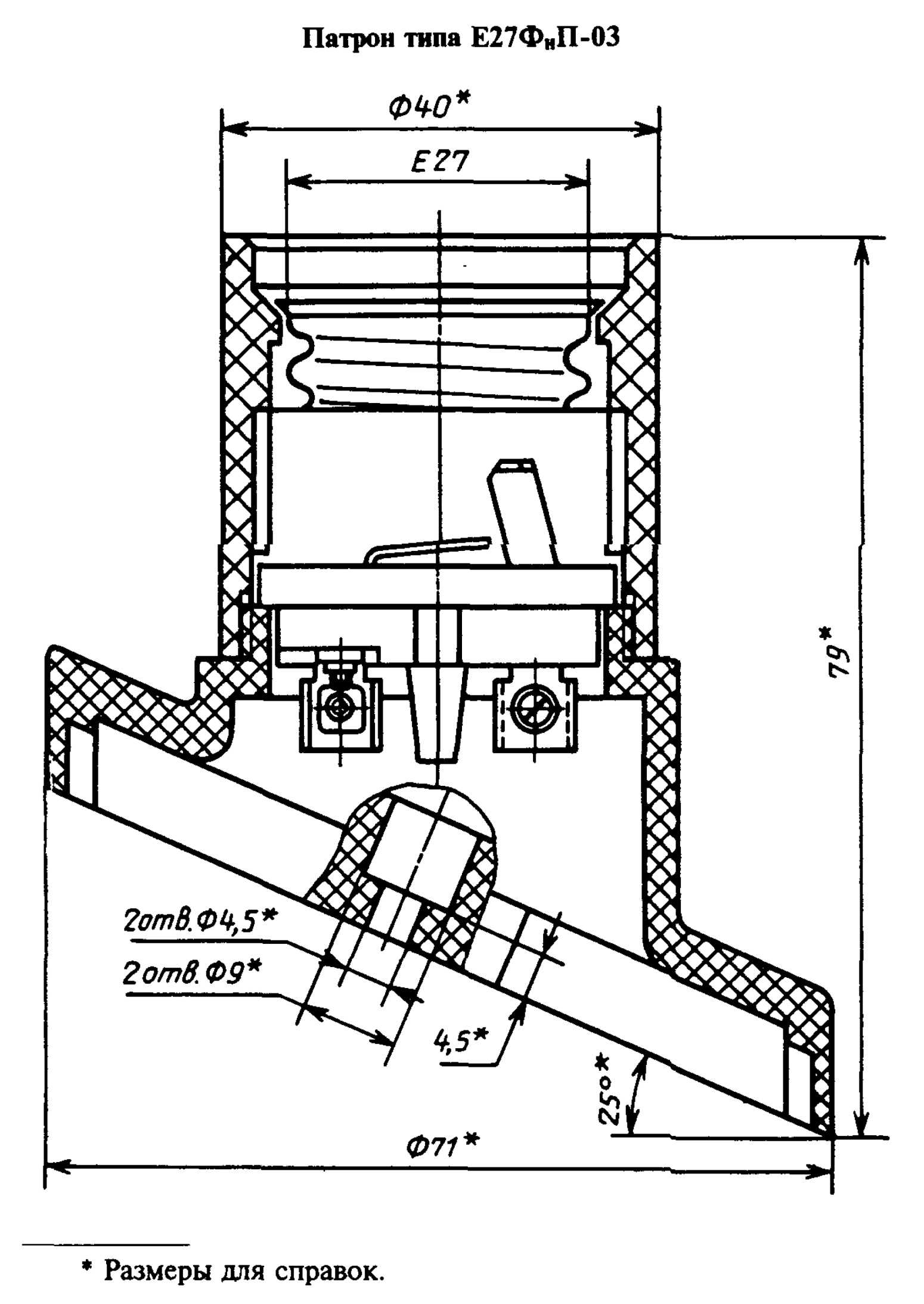 Крепление патрона за токоподводящий провод без его дополнительного закрепления не допустимо. В донышко вворачивается пластмассовая втулка с отверстием в центре для прохождения электропровода, в которой предусмотрен фиксирующий пластмассовый винт.