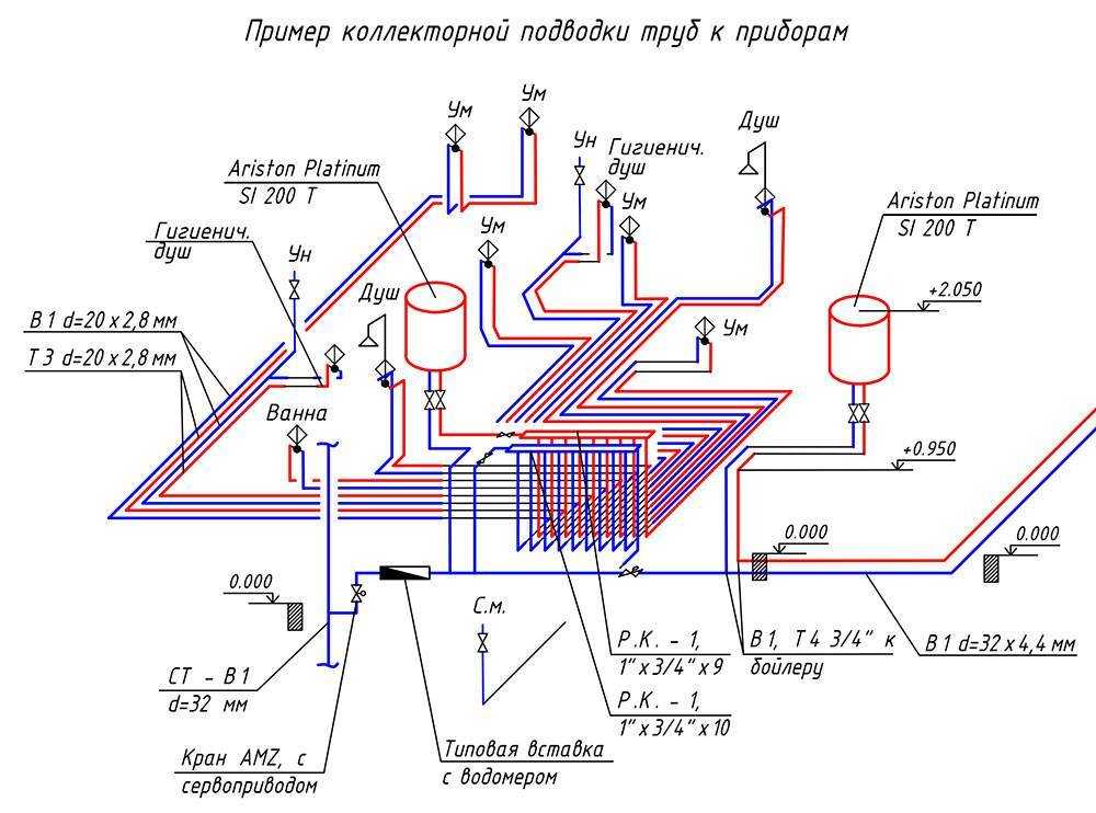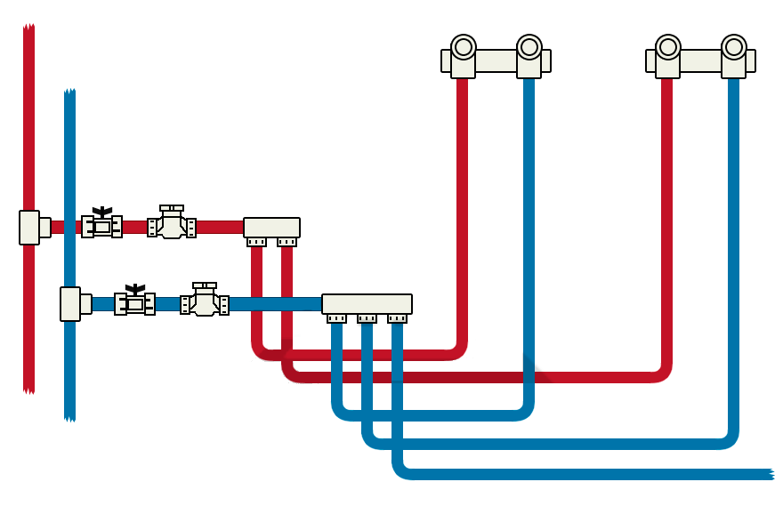 - Для холодной и горячей воды монтируются отдельные коллекторы.