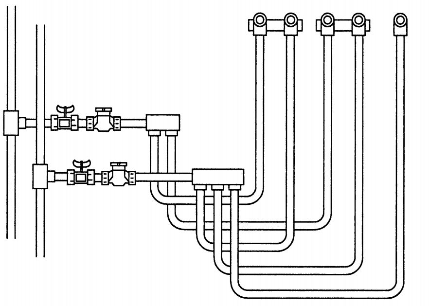В отличие от последовательной (тройниковой), схема коллекторной системы водоснабжения позволяет избежать падения напора при расходе воды через произвольный прибор. Попросту говоря — когда вы открываете кран на кухне, из ванной не доносятся полные боли и горечи возгласы, принимающего душ члена семьи.
