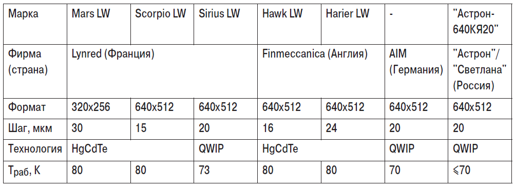 Основные производители и параметры длинноволновых охлаждаемых приемников представлены в табл. 1.