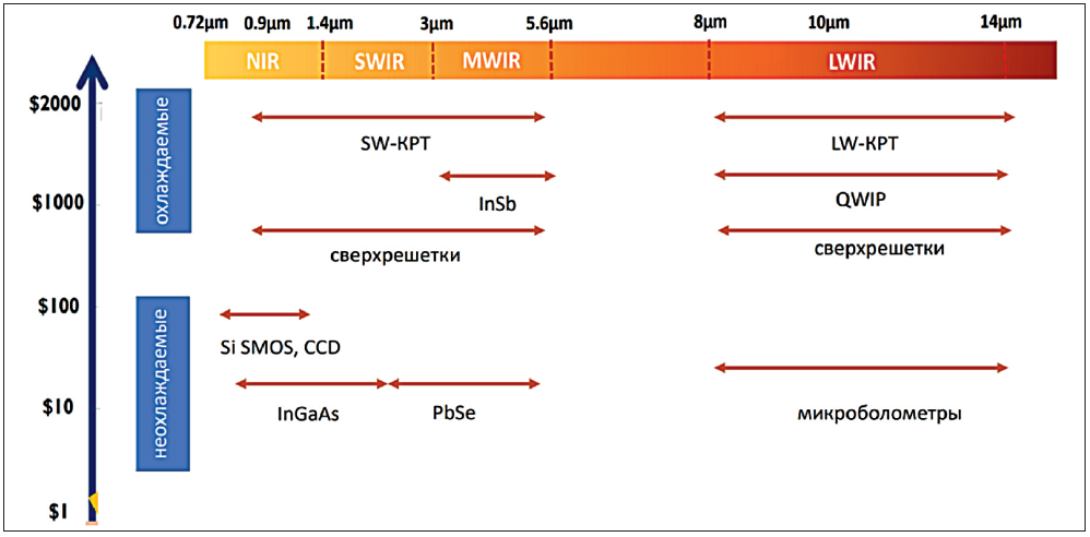 Рис. 3. Основные материалы, применяемые при создании ИК-датчиков (КРТ – теллурид кадмия-ртути, QWIP – инфракрасные датчики на квантовых ямах, InGaAs – арсенид индия-галлия, InSb – антимонид индия)