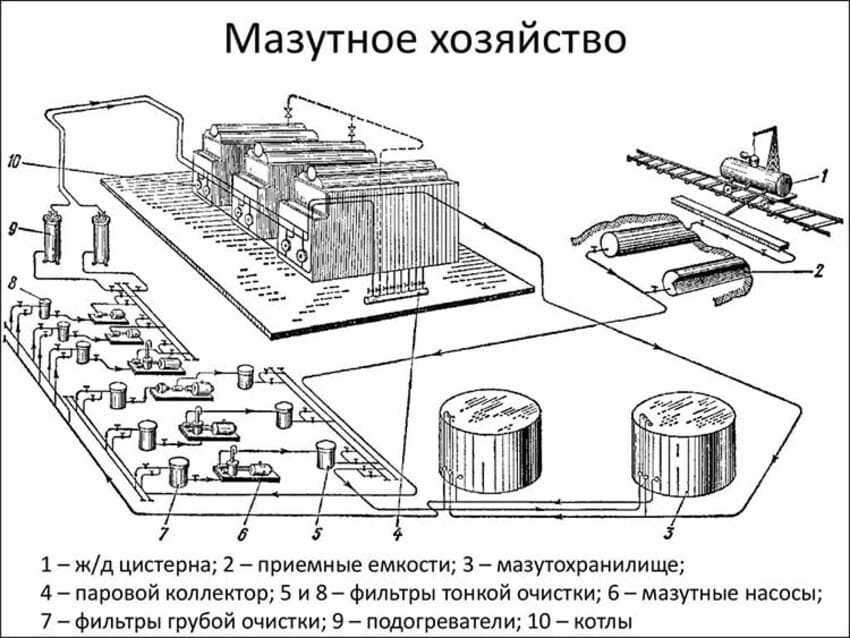 - комплексы сооружений для приёма и первичной переработки топлива: газовое хозяйство, мазутное хозяйство, угольное хозяйство, а также сооружения для приёма воды или для её глубокой химической очистки;
