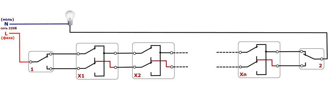 Схема управления светом от пяти и более мест с помощью проходных и перекрестных выключателей (1 и 2 — сквозные, х1, х2..хн — перекрестные)